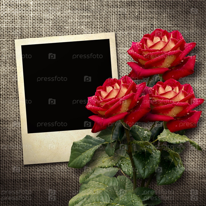 Полароидный снимок и розы на мешковине