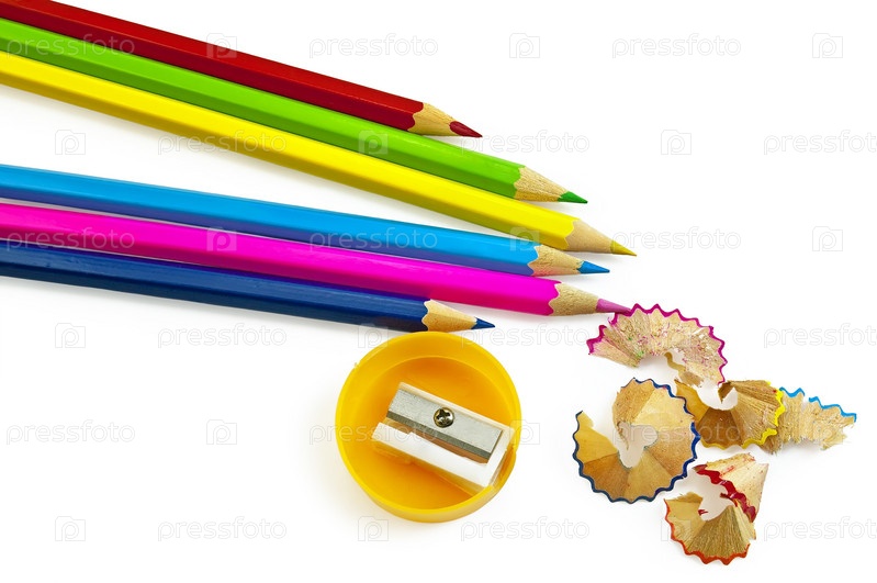 Цветные карандаши, точилка и стружка на белом фоне