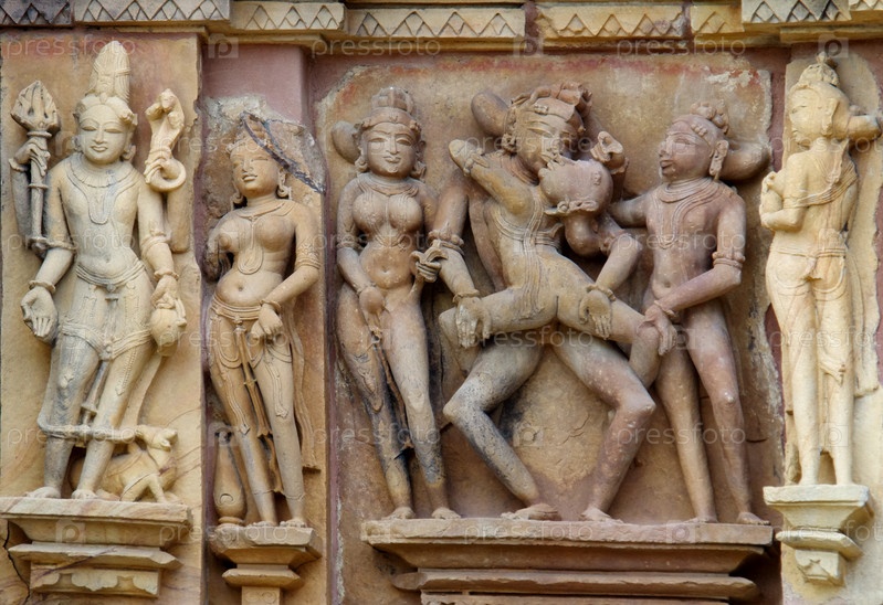 Резной эротический барельеф в индуистском храме в Каджурахо, Индия