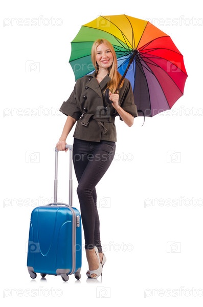 Женщина с чемоданом на белом фоне