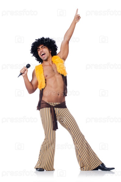 Мужчина с афро и микрофоном, изолированный на белом фоне