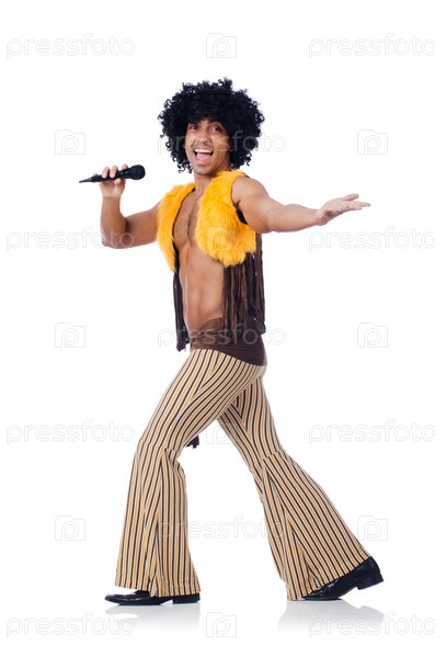 Мужчина с афро и микрофоном, изолированный на белом фоне