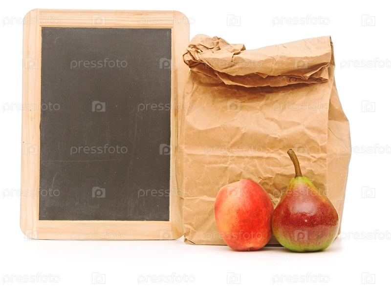 Школьный обед с пустой доской на белом фоне