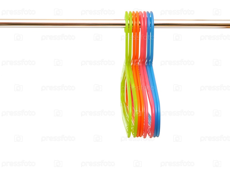 Красочные пластиковые вешалки висят на перекладине на белом фоне