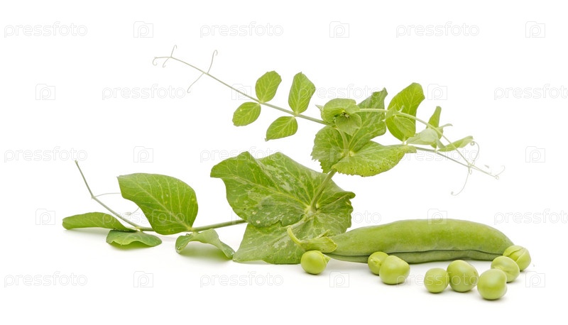 Свежий горох с зелеными листьями, изолированный на белом фоне