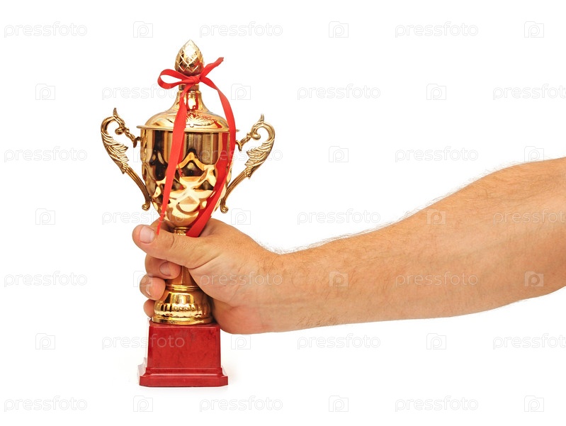 Человек, держащий чемпионский золотой трофей на белом фоне