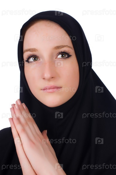 Молодая мусульманка молится, изолированная на белом
