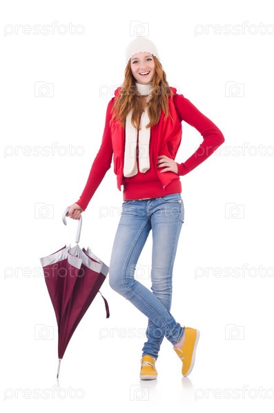 Молодая женщина с зонтиком на белом фоне