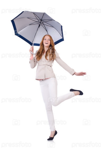 Молодая женщина с зонтиком на белом фоне