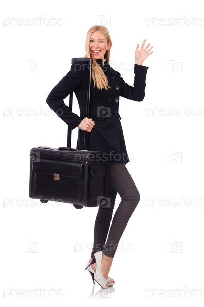 Бизнес-леди с чемоданом на белом фоне