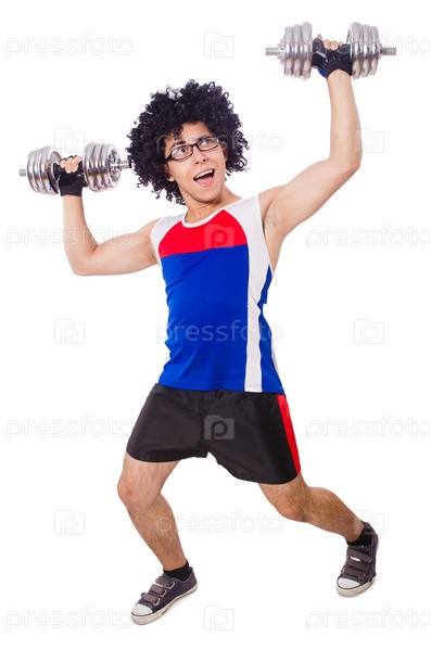 Забавный мужчина с гантелями