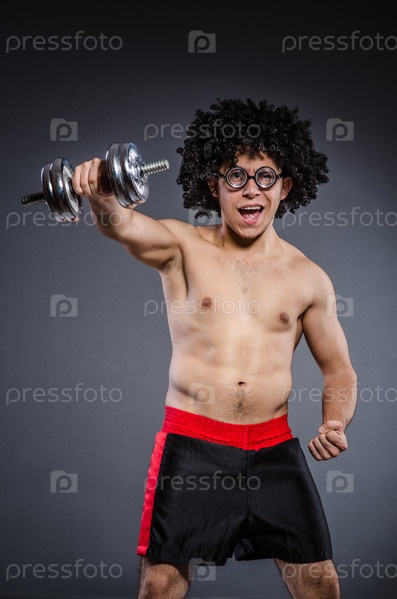 Забавный мужчина с гантелями