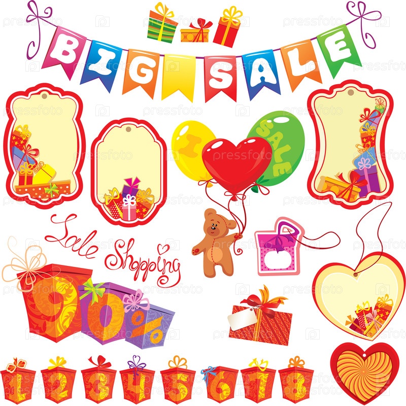 Красочные подарки, этикетки, мишка и цифры