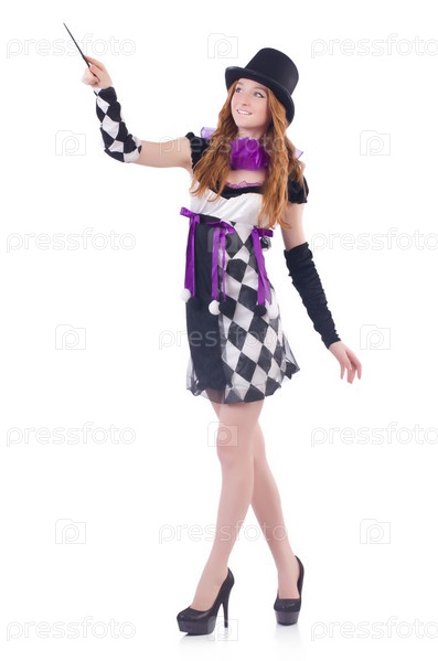 Фокусница с палочкой на белом фоне