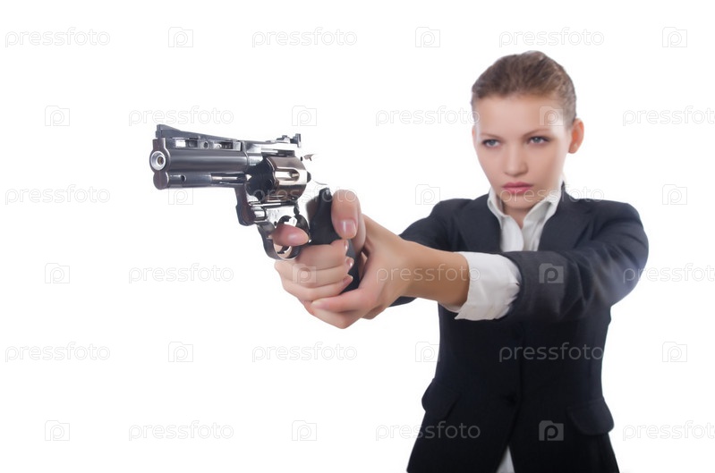 Бизнес-леди с пистолетом на белом фоне