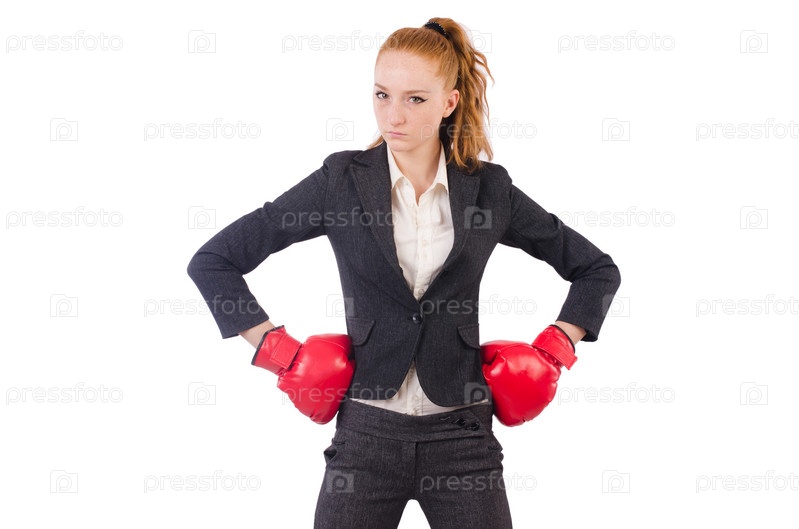 Деловая женщина в боксерских перчатках на белом фоне