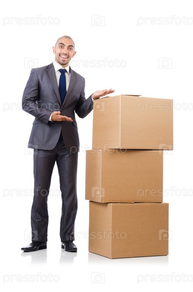 Бизнесмен с коробками, изолированный на белом