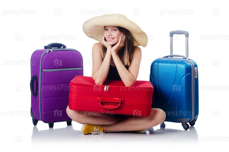 Девушка с багажом, изолированная на белом фоне