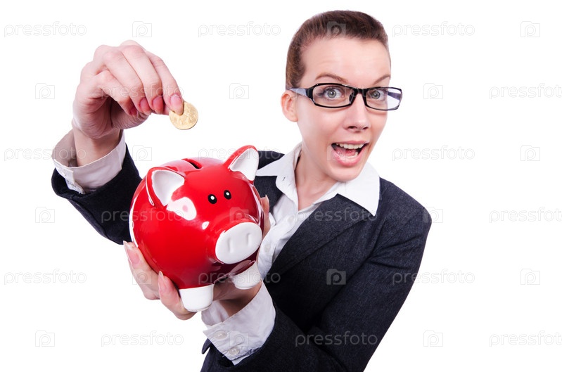 Женщина с копилкой на белом фоне