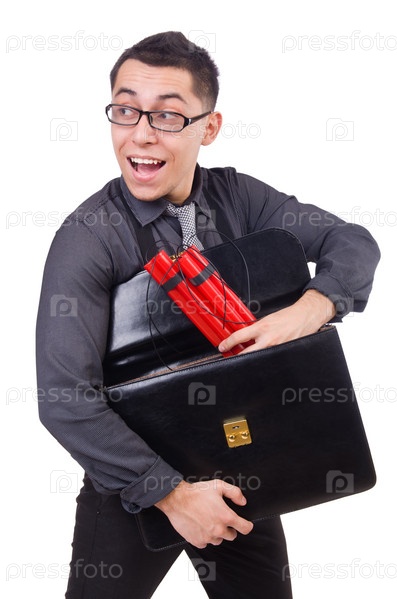 Бизнесмен с динамитом, изолированный на белом