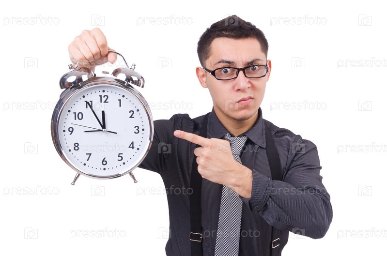 Смешной бизнесмен с часами, изолированный на белом
