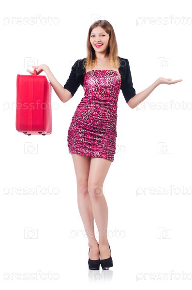 Девушка с багажом, изолированная на белом фоне