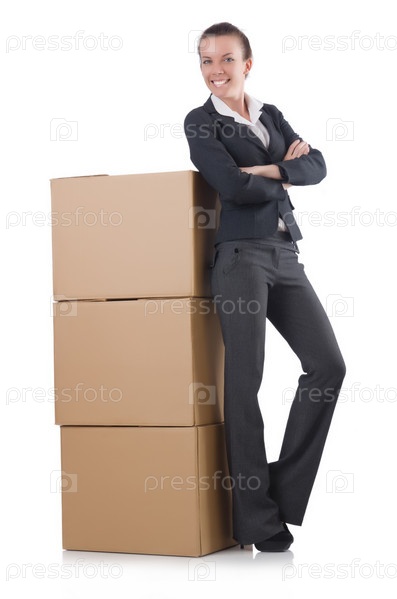 Деловая женщина с коробками на белом фоне