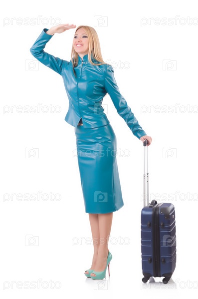 Девушка с багажом, изолированная на белом фоне