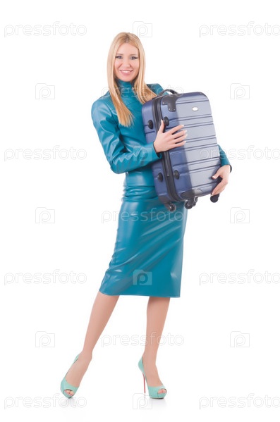Девушка с багажом, изолированная на белом фоне