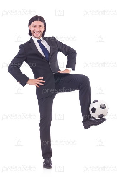 Человек с футбольным мячом, изолированный на белом