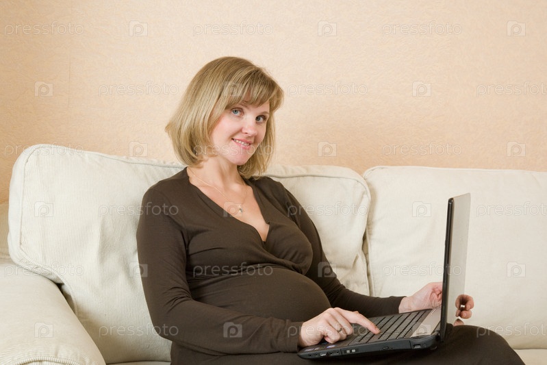 Беременная женщина сидит на диване с ноутбуком