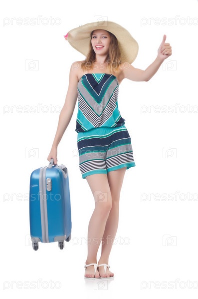 Девушка с багажом, изолированная на белом фоне