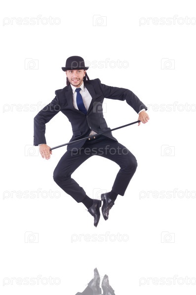 Мужчина танцует с тростью на белом фоне