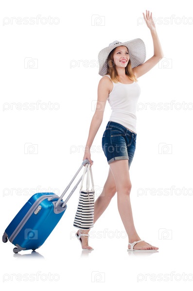 Девушка с багажом, изолированная на белом фоне