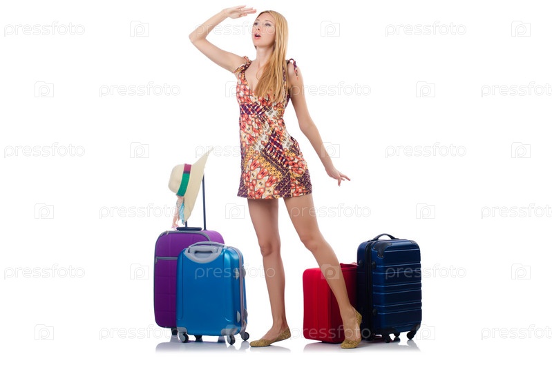 Девушка с багажом, изолированная на белом фоне