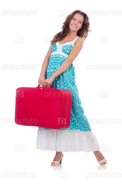 Девушка с багажом, изолированная на белом фоне