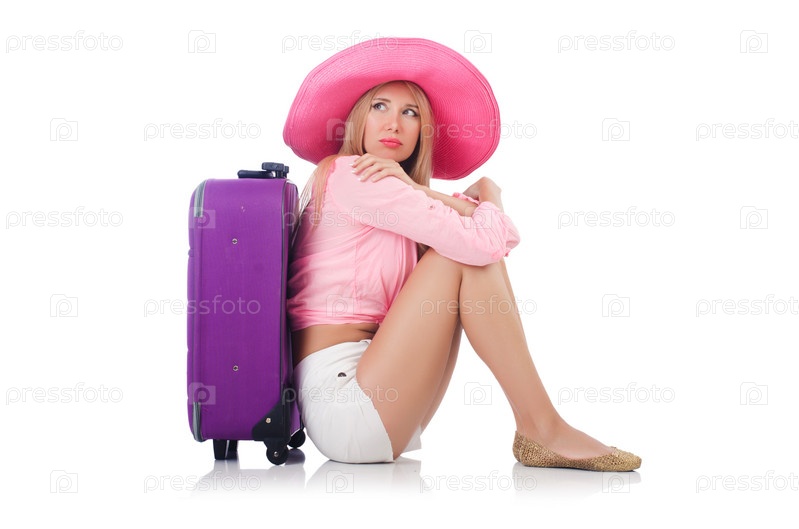 Девушка с багажом, изолированная на белом фоне