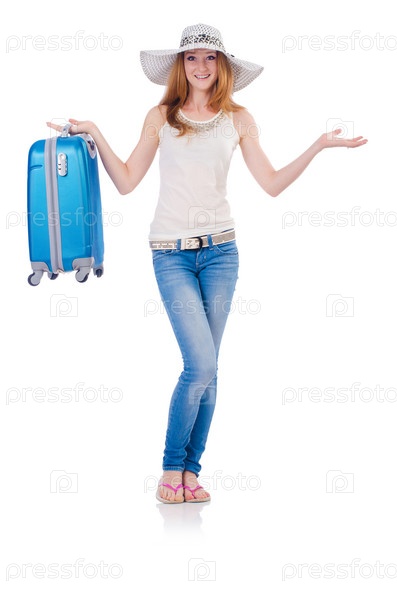 Девушка с багажом, изолированная на белом фоне