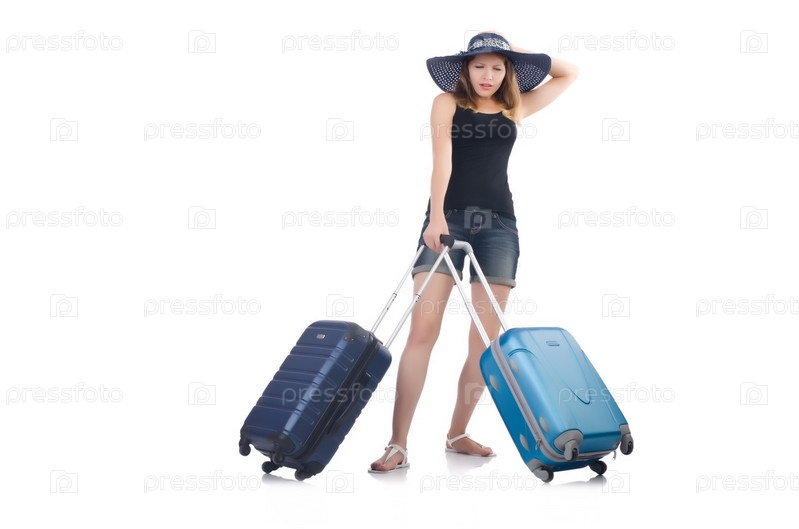 Девушка с багажом, изолированная на белом фоне