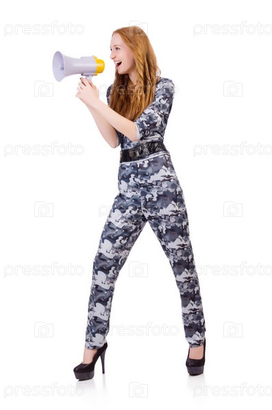 Рыжий солдат с громкоговорителем на белом фоне