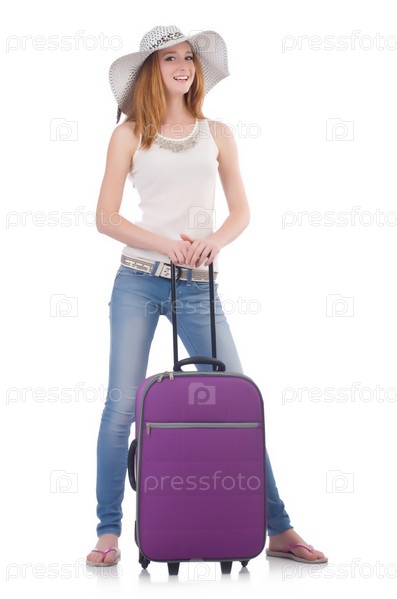 Девушка с багажом, изолированная на белом фоне