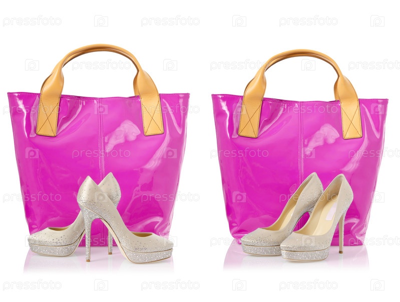 Коллаж из обувью и сумками на белом фоне