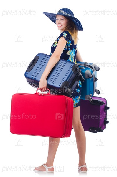 Девушка с багажом, изолированная на белом фоне