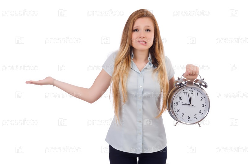 Молодая женщина с часами на белом фоне