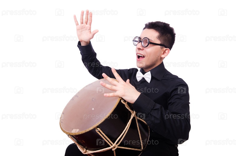 Забавный человек с барабаном на белом фоне