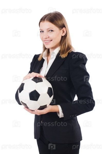 Предприниматель с футбольным мячом на белом фоне