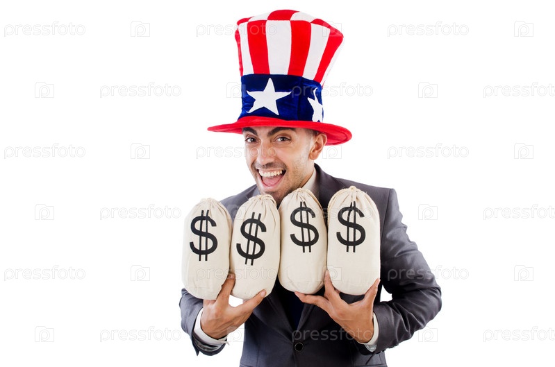 Человек с мешками долларов на белом фоне