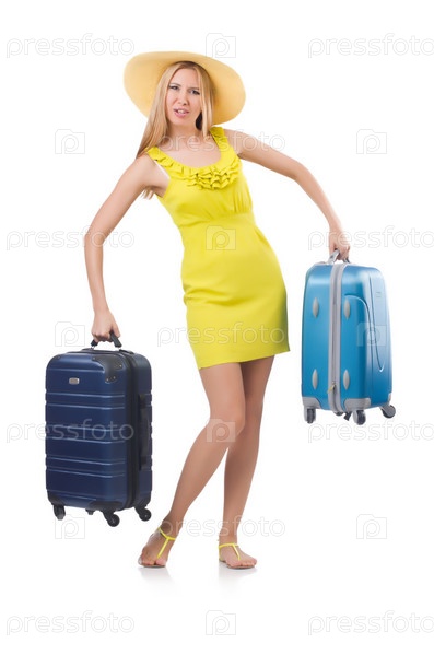 Девушка с багажом, изолированная на белом фоне