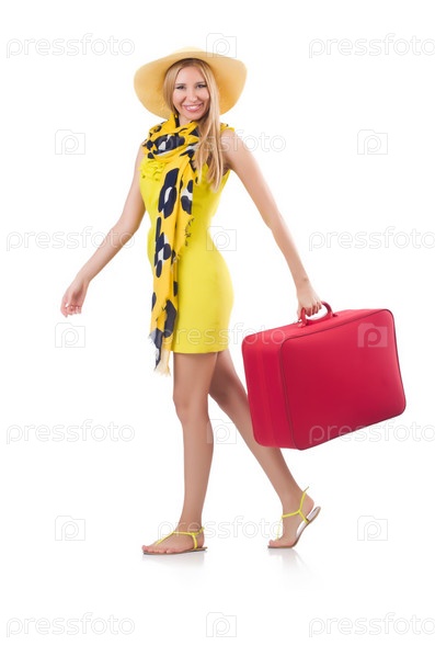 Девушка с багажом, изолированная на белом фоне