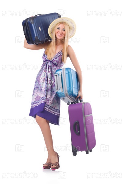 Девушка с багажом, изолированная на белом фоне